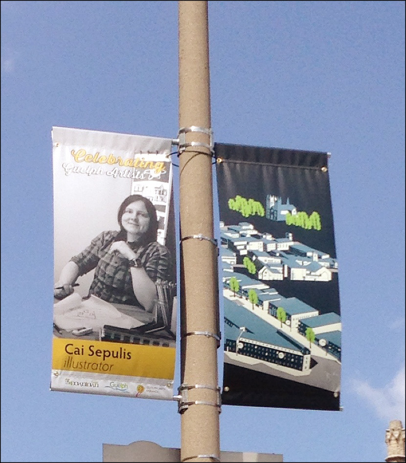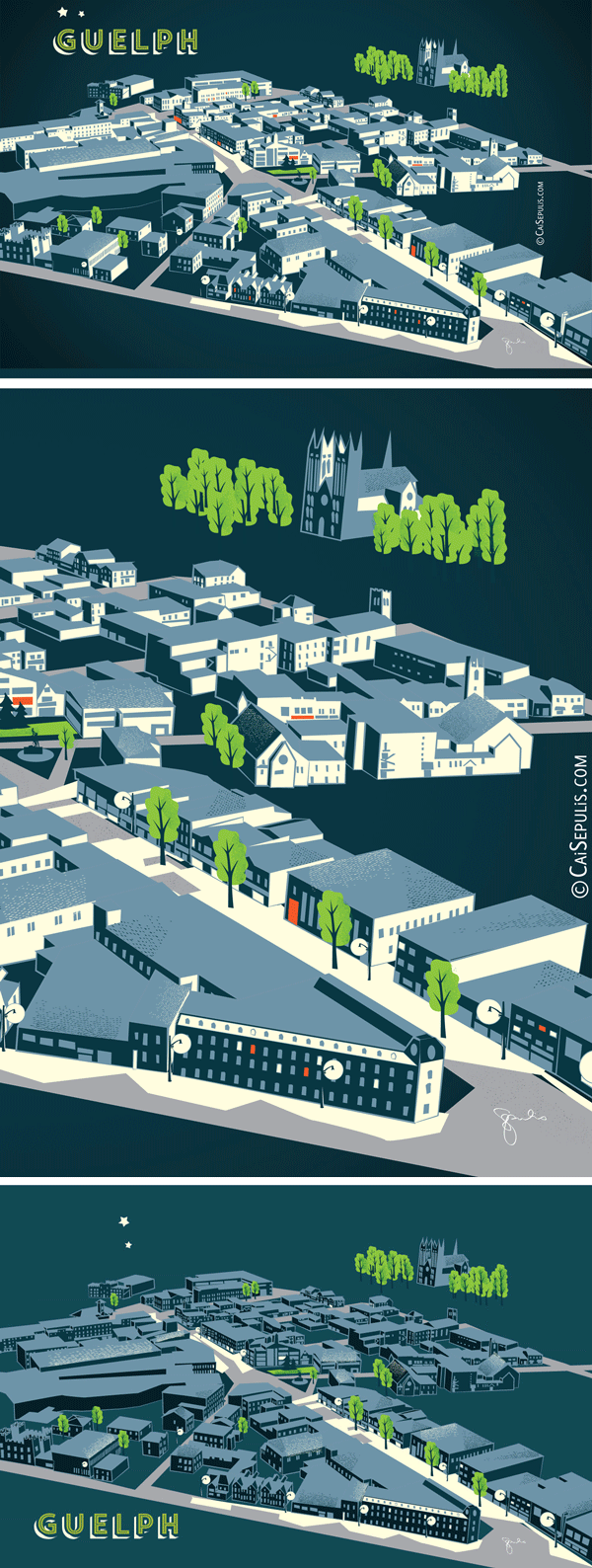 I illustrated this aerial view of Downtown Guelph (and quickly animated it) which has since been used for advertising and the City's thank-you gifts for visiting speakers.