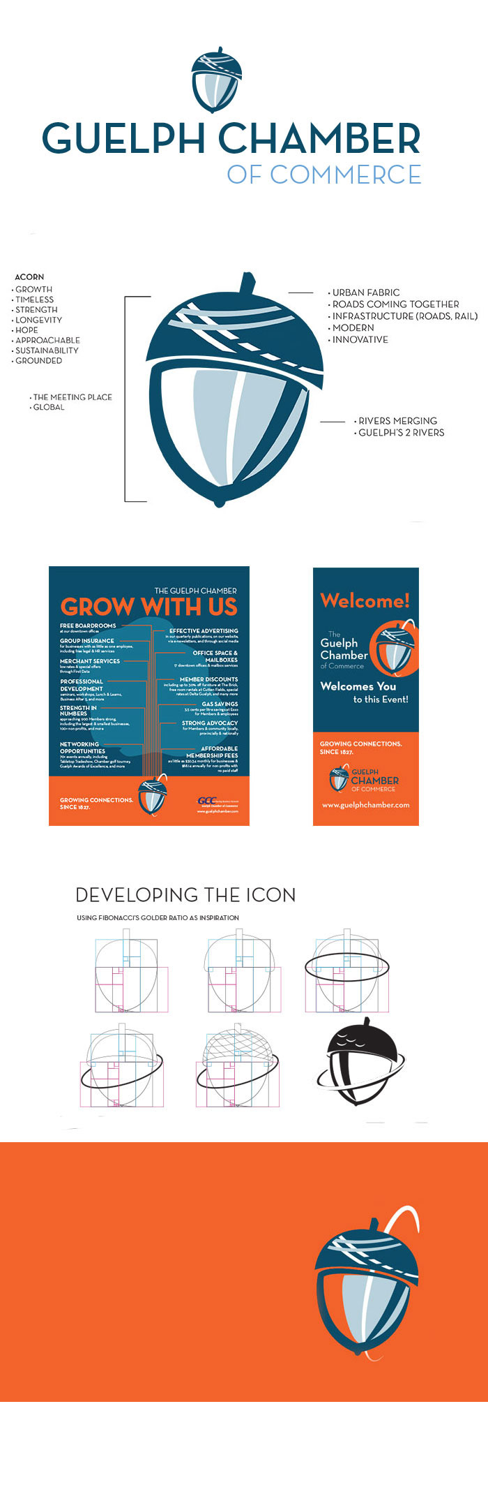 An organization since the early 1800’s, and a logo that had lasted atleast 30 years; no small task for me to create a new logo and brand for an organization with such longevity and history. To keep some connection to the past, we first off opted to keep the brand colours quite similar and use the double blue and orange, but pump the colours a touch to make them a bit more modern. I wanted to develop something iconic and memorable as the main icon; something that represented growth and longevity, but most of all stood out among other Chamber of Commerces and spoke more about the Chamber being a grassroots, community-oriented not-for-profit organization, rather than being a conventional business-like logo. The acorn is about neutrality and a welcoming meeting place. In order to add some ‘business flare’ to the logo, the ‘atomic acorn’ was created. The marks on the top of the acorn suggest city infrastructure such as roads and rail. The double blue in this case also represents the two main rivers in Guelph (the Eramosa and the Speed) and how the Chamber sits nearly at their junction. The brand was adapted to the web by an external team and a new one-sheet, banner display and postcard campaign was developed.