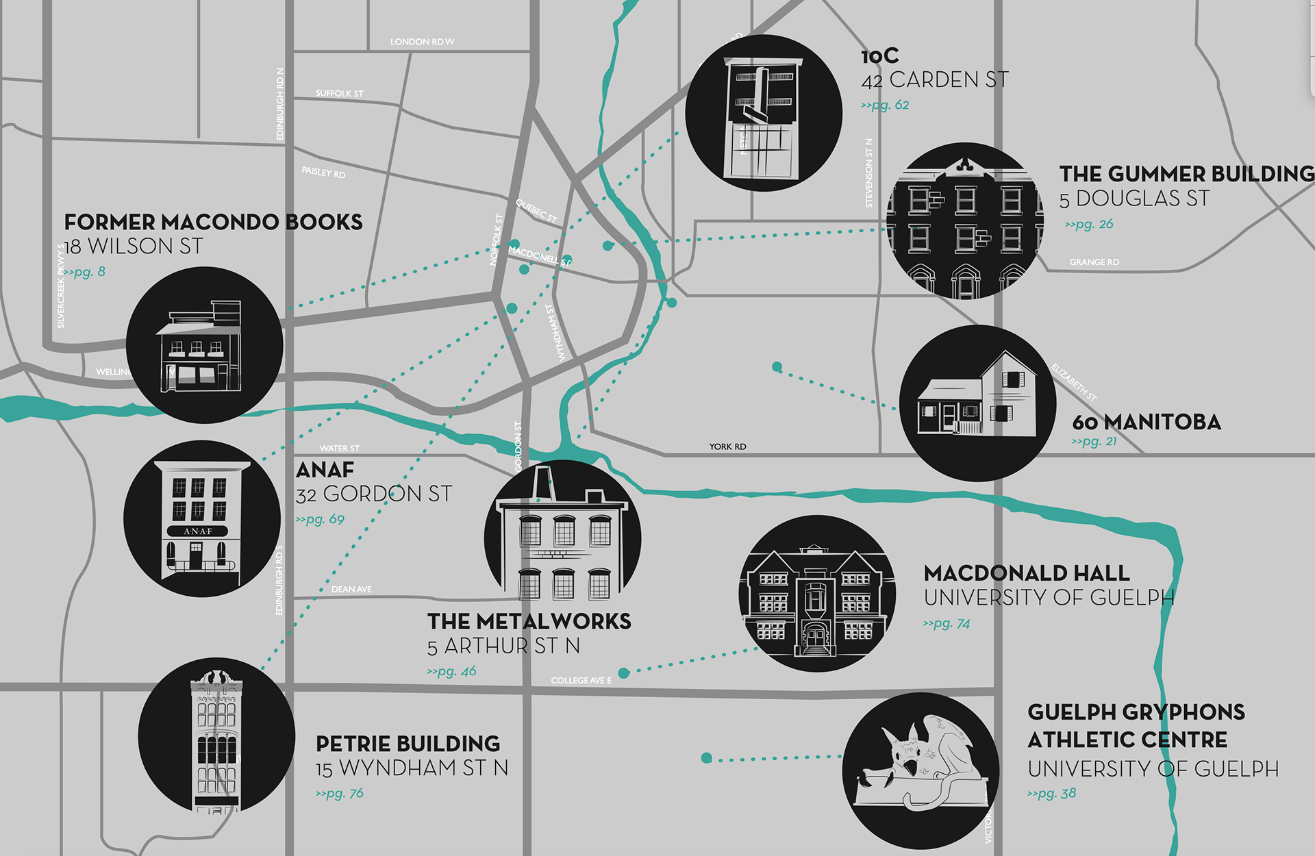 Map with overlaid illustrations of locations, created for Guelph Chamber of Commerce's 'The Know' magazine.