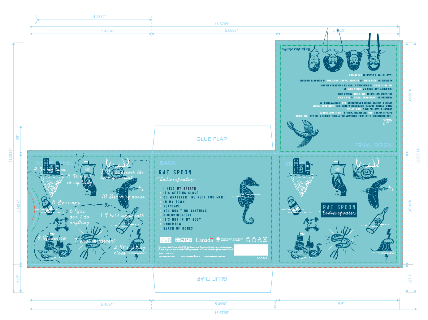 Illustration & design for Rae Spoon's album bodiesofwater, laid out as an ecosleeve for production.