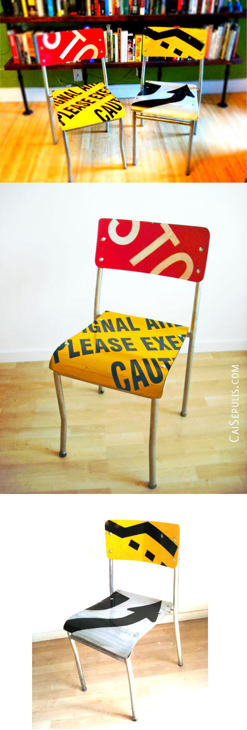 Created out of reclaimed traffic signs, these chairs were shaped and welded to reburbish old school chairs and turning them into new attractive pieces.